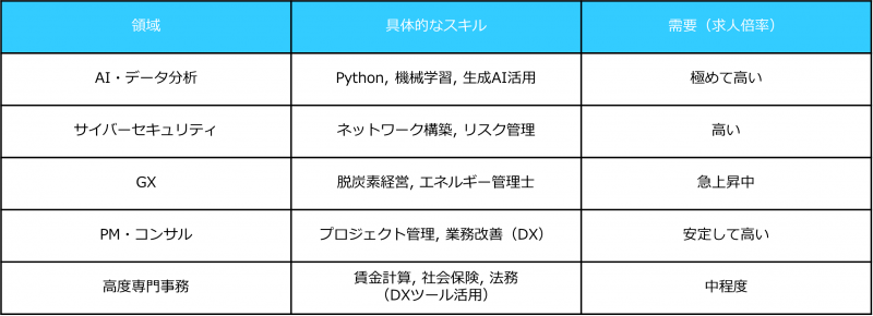 ここで重要なのは、単一のスキル習得で終わらせないことです。ひとつのスキルではなく「既存の専門性×デジタル」の掛け合わせが最も効率的に市場価値を高めます。例えば、経理のスキルにデータ分析を掛け合わせることで、データアナリストの役割も担い、市場価値が1.5倍〜2倍へと跳ね上がります。